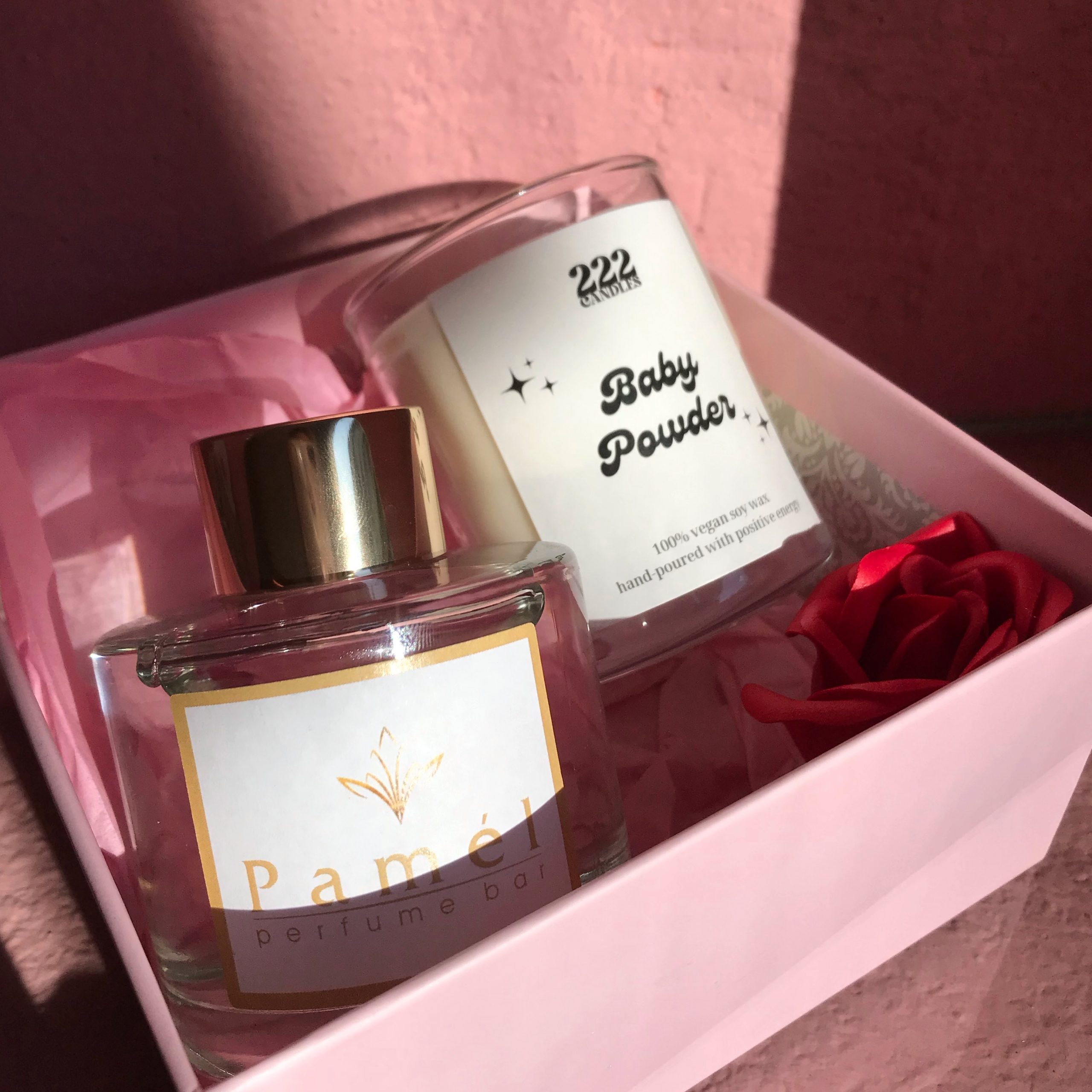 Αρωματικο χώρου 100μλ άρωμα πούδρας και αρωματικό κερι σόγιας με πούδρα 120γρ.